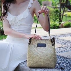 Retro Chinese-style Woven Straw Bucket Bag Hand-woven Rattan Bag Travel Beach Bag